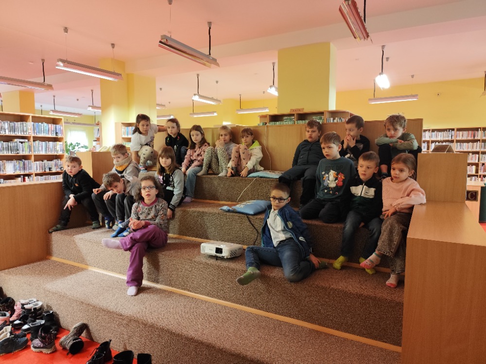 Dne 23.2.2026 jsme se vydali do nedaleké knihovny v Heřmanově Městci. Knížky máme moc rádi, a tak jsme se těšili, že se dozvíme nové věci. Po příchodu jsme se posadili na schody a paní z knihovny si s námi povídali.
