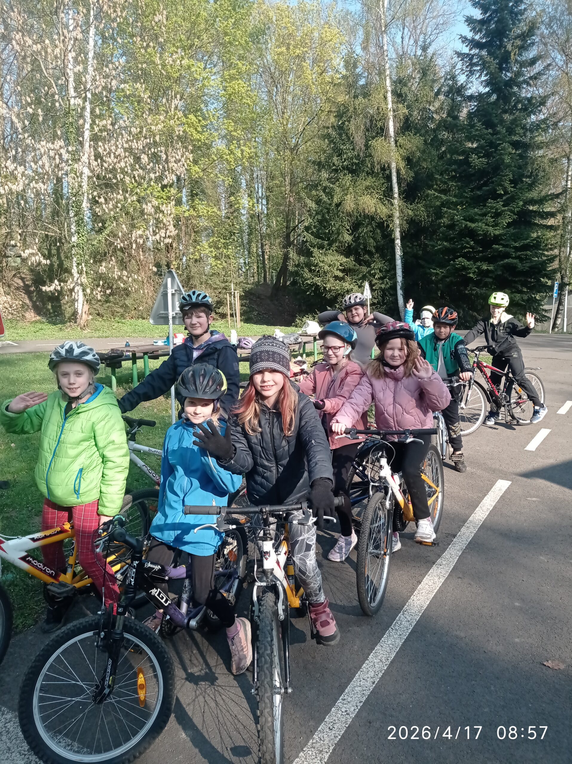 V pátek 17. 4. 2026 žáci 3.B zakončili dopravní výchovu poslední lekcí na dopravním hřišti. Žáci se v průběhu školního roku naučili, jaké části musí mít jízdní kolo, abychom na něm mohli vyjet na silnici. Také vědí, jaké ochranné pomůcky