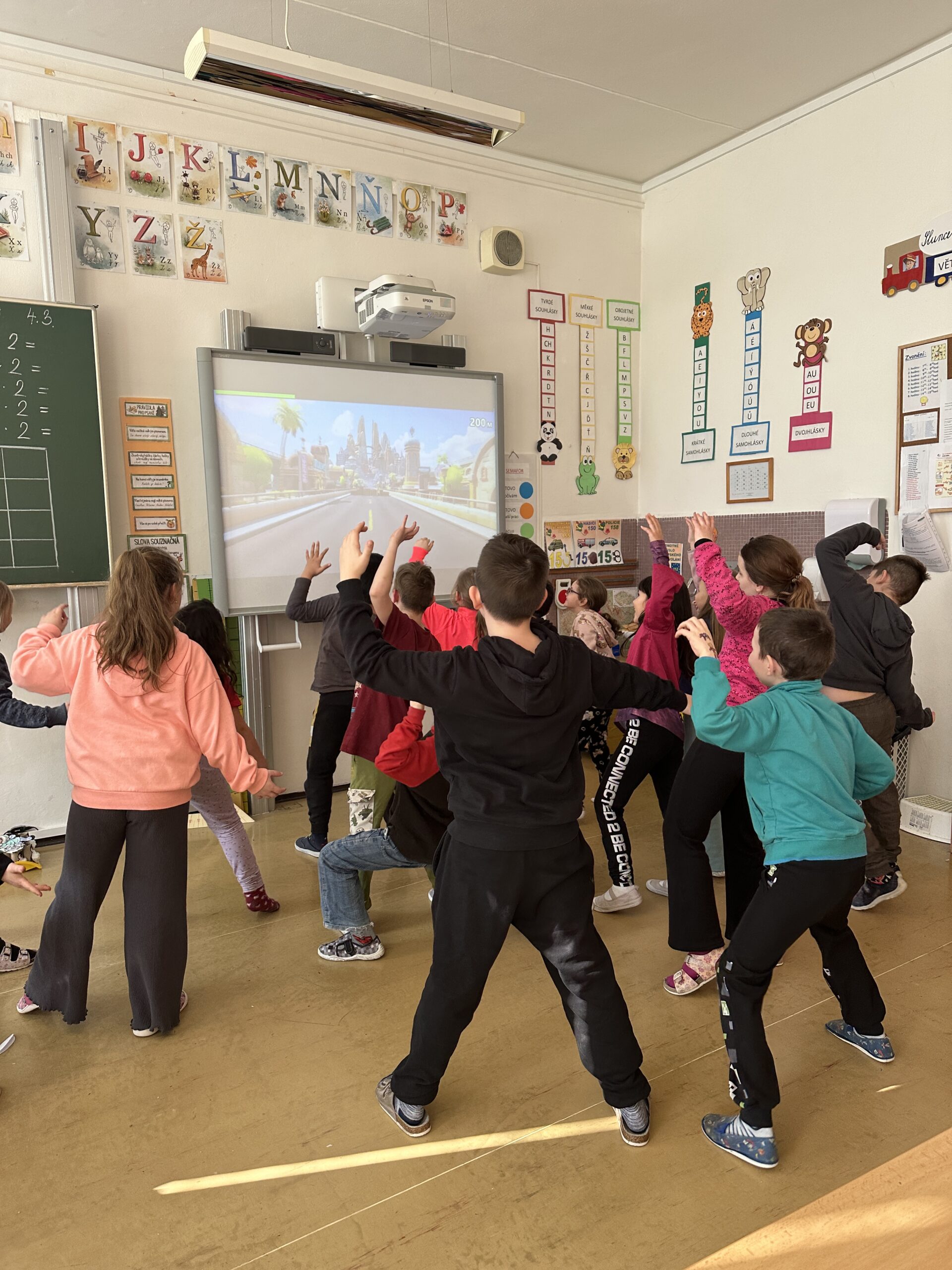 Jelikož nám tento týden počasí příliš nepřeje, rozhodli jsme se dětem zpestřit program pohybovou aktivitou ve třídě. Připravili jsme si zábavné cvičení podle videa, které děti s nadšením napodobovaly – protahovaly se, skákaly, tančily i posilovaly. Aktivita je velmi bavila, zapojily
