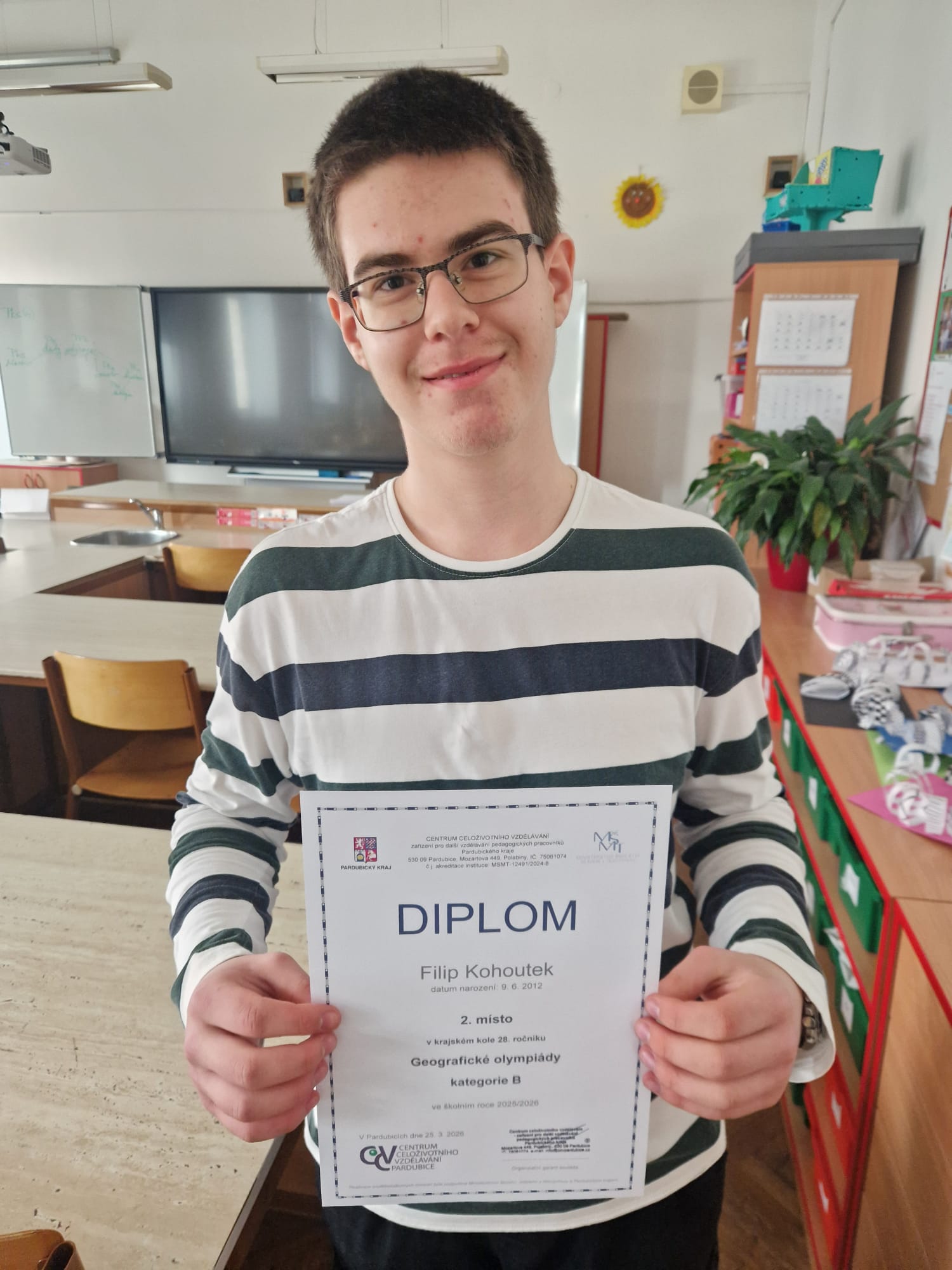 Dne 25.3. se konalo krajské kolo zeměpisné olympiády, do kterého postoupil z okresního kola Filip Kohoutek ze 7.B. Soutěž proběhla v Pardubicích a skládala se ze tří různých částí testů. Díky své píli a pečlivé práci se Filipovi podařilo vybojovat skvělé 2.místo