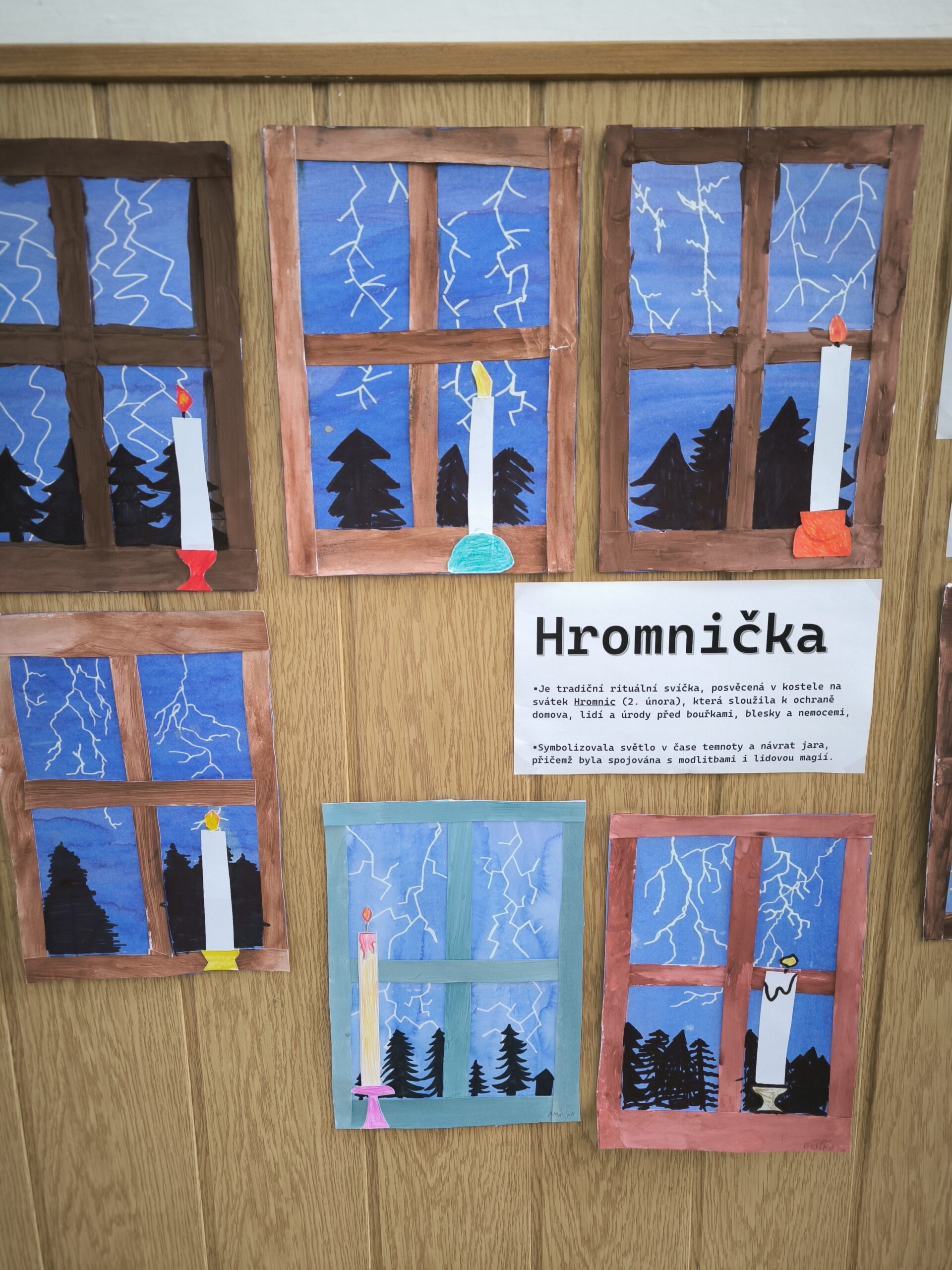 Žáci 4. B se snad postarali, aby naše škola byla v bezpečí. Rozsvítili na oknech svíčky hromničky, které mají chránit obydlí před bleskem, který může způsobit požár a smrt. Zároveň si připomněli pranostiku „Na Hromnice o hodinu více.“ Hromnice jsou oslavou
